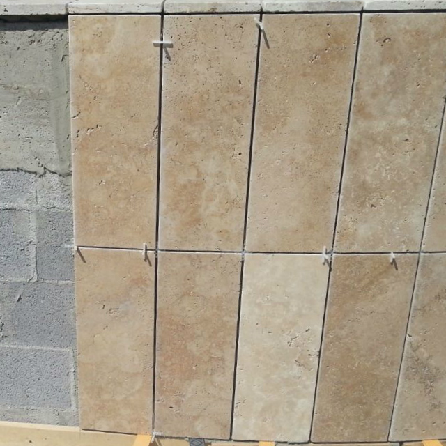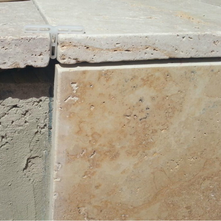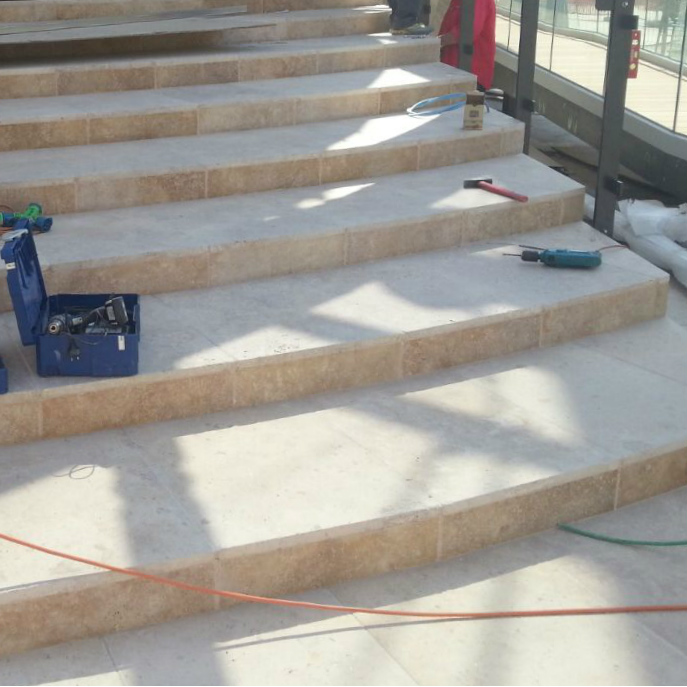 Die Materialwahl fiel für dieses Projekt auf den Travertin PDR 029 Autunno ; ein Travertin, bei dem die natürlichen Töne überwiegen; von einem hellen Beige bis zu einem Braun mit rötlichen Einschlüssen. Dieser Travertin gehört der Auswahl Nuvolati, an, das heißt es sind Steine die gegen das Lager geschnitten sind, also gegen die Schichtung, was zu der wolkenartigen Struktur führt.