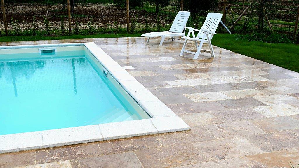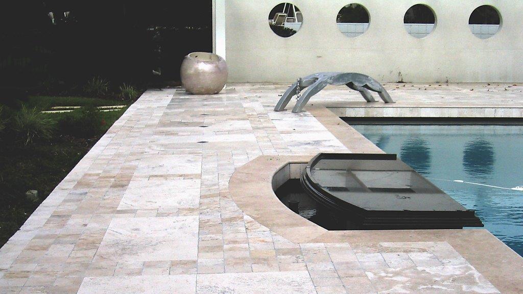 Travertin kann den Außenbereich Ihres Pools gestalten, oder das gesamte Becken verkleiden; wie bei vielen Naturmaterialien bleibt seine Schönheit ungeachtet der Jahreszeiten und des Alters erhalten.