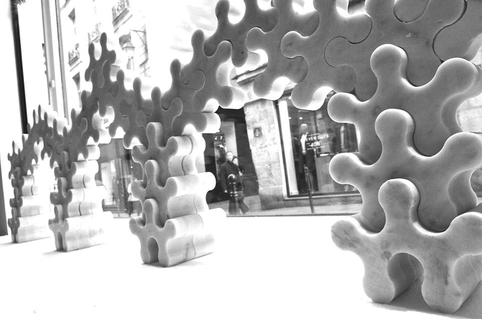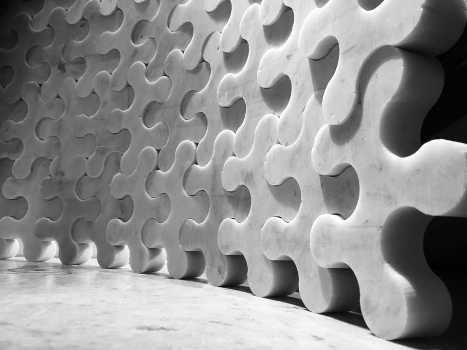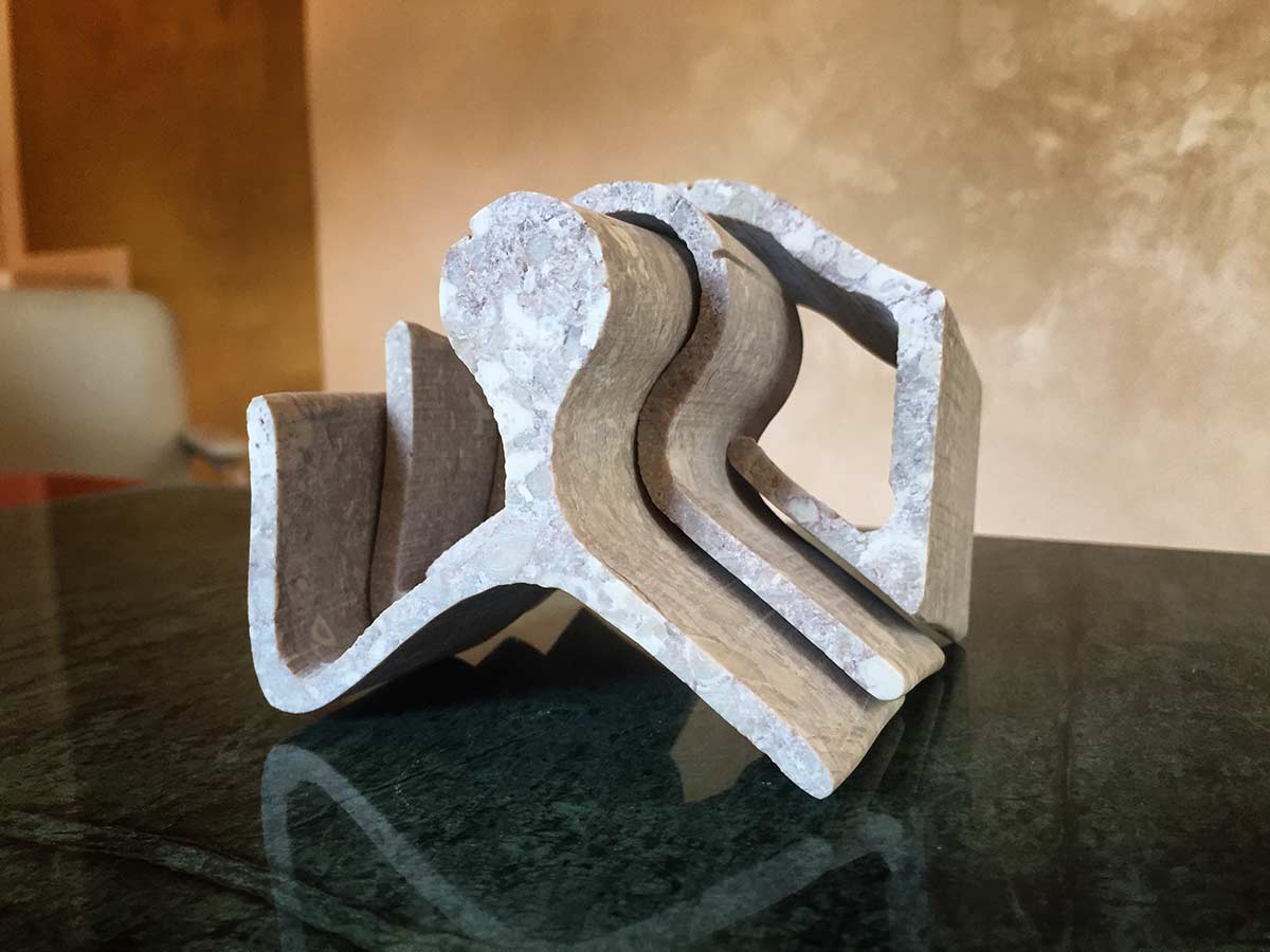 Im Moment arbeite ich an einigen Marmormodulen, die ich Moleküle nenne und die sich bei immer neuen Bewegungen und Anordnungen ineinander verzahnen. Es sind Teile, die ich mittels Diamantdraht oder Water-Jet herausschneide. Sie erinnern an Puzzleteile, die für Böden, Wände verwendet werden können oder zu abstrakten Skulpturen werden.